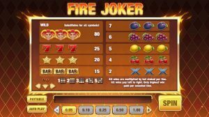 Fire Joker uses a simple 3-reel design with friendly bet limits of 0.05 to 50 coins. To form a win, you must match at least three symbols on one of the five bet lines. Note that the lines are not adjustable. This means all of them are open to help you form wins on any given spin.